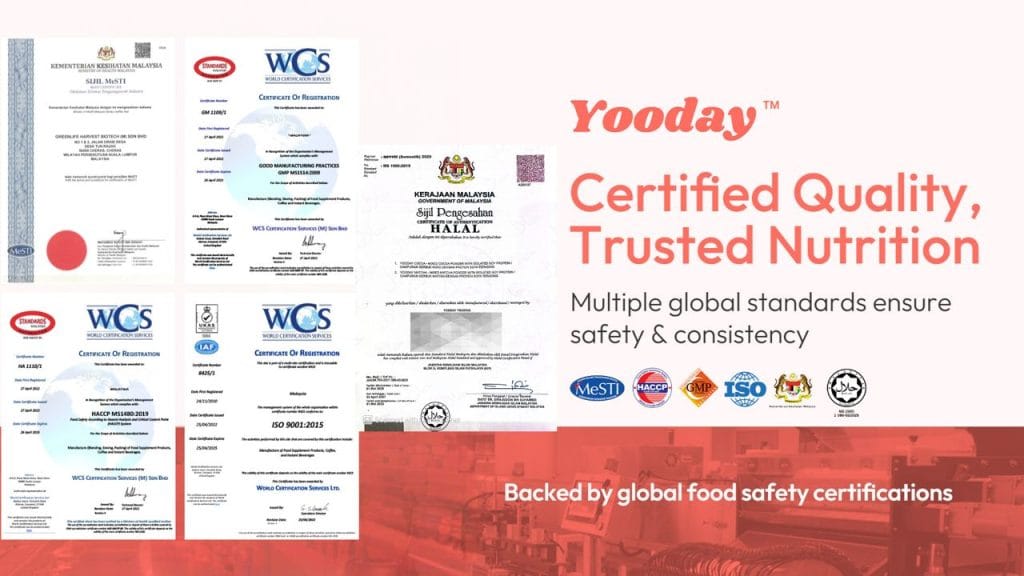 Every Yooday product is carefully formulated with premium ingredients and produced in facilities certified by HACCP, GMP, ISO, MESTI, and HALAL, ensuring the highest standards of safety and quality.